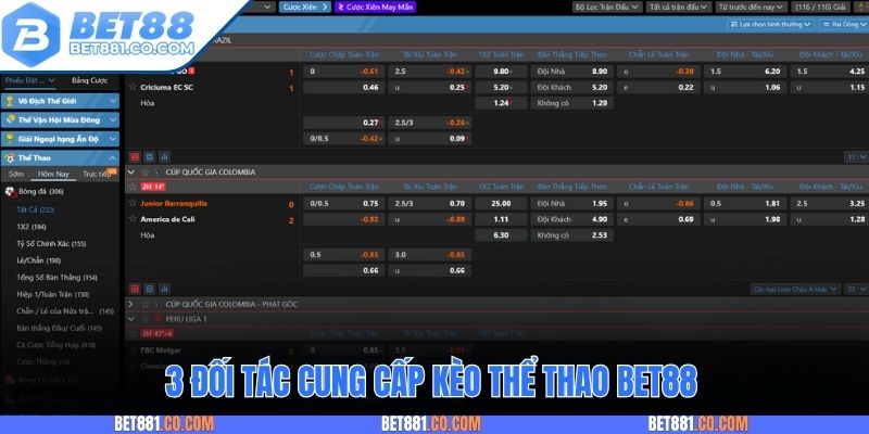 Thể thao Bet88 liên kết với 11 đối tác uy tín trên thị trường tạo nên 11 sảnh cược chất lượng. Điển hình như:
