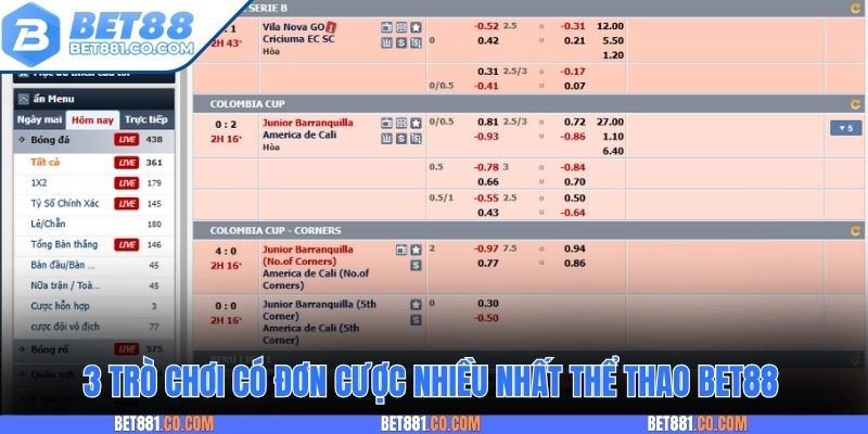 Thống kê cho thấy, 70% lượng đơn cược thể thao Bet88 tập trung vào 3 trò chơi chủ lực sau: